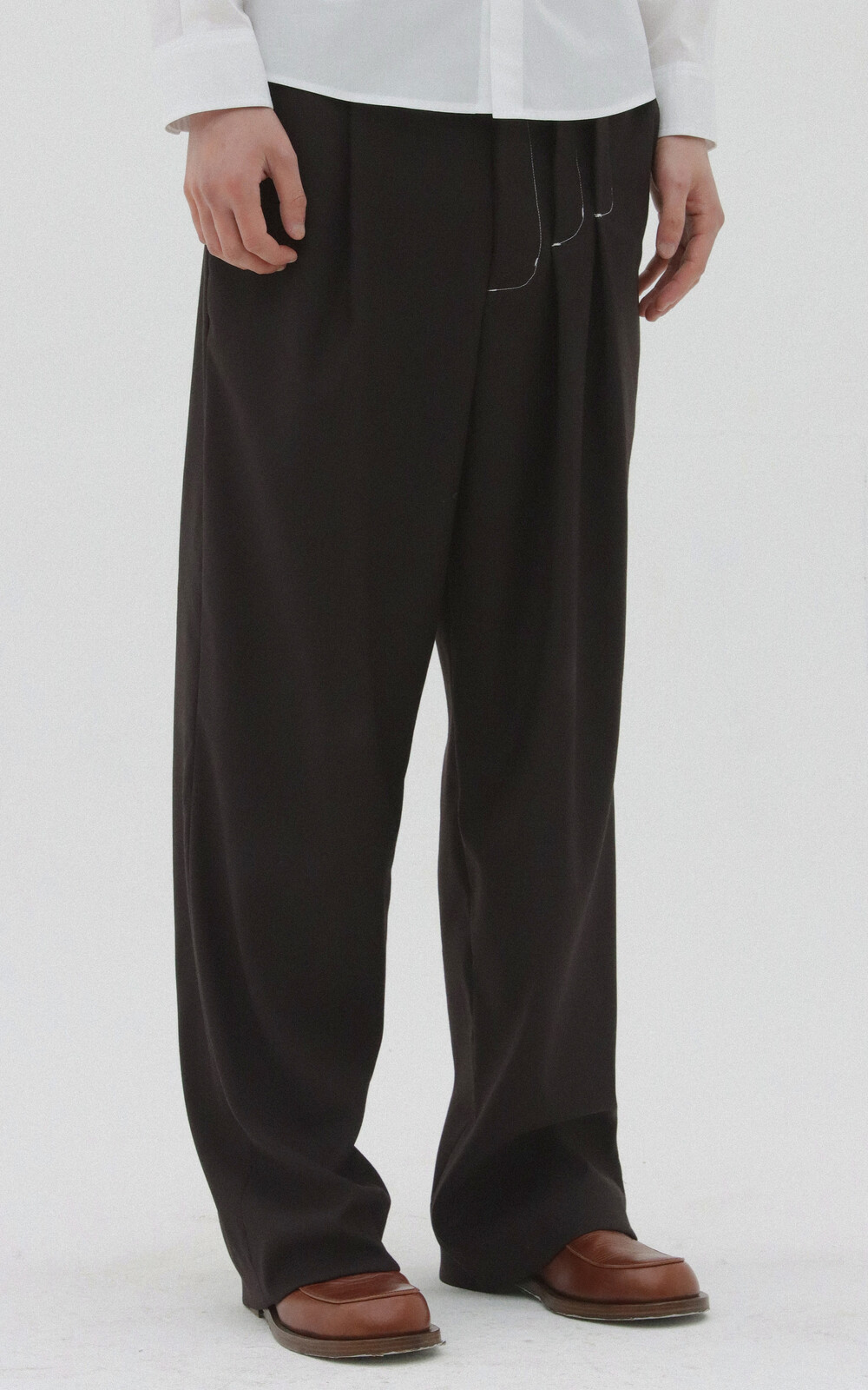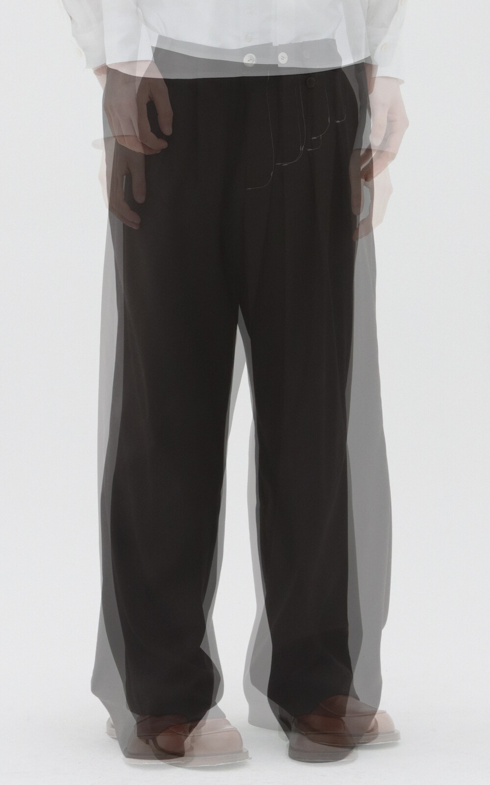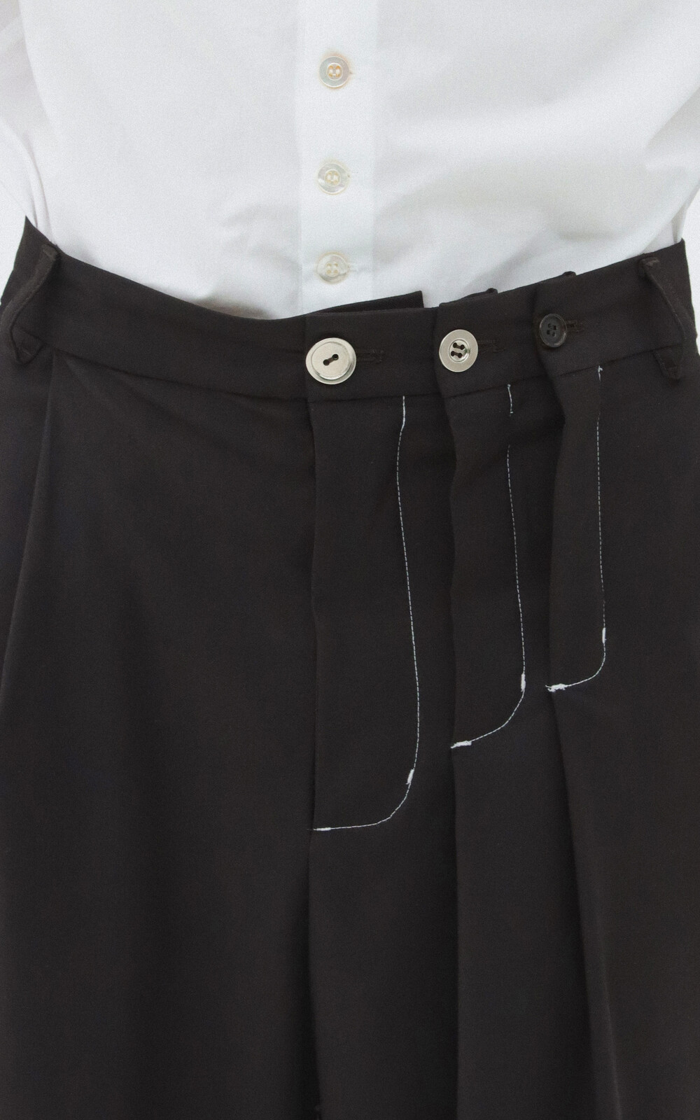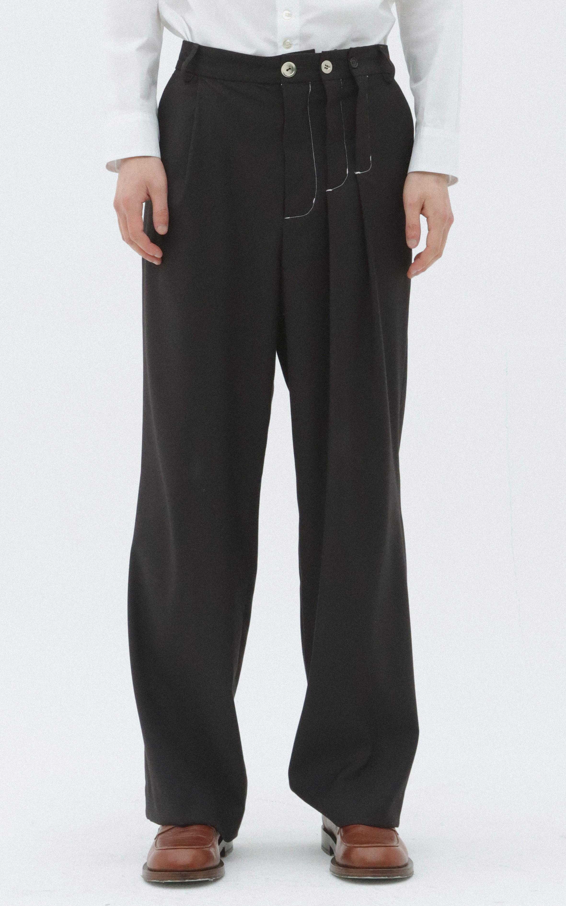 어두운 브라운 컬러로 앞 상단의 터크(주름)구조가 연달아 위치하여 바지 플라이(오프닝)가 3개로 보이는 디테일. 사이즈가 다른 3개의 메탈/소뿔 단추 사용.