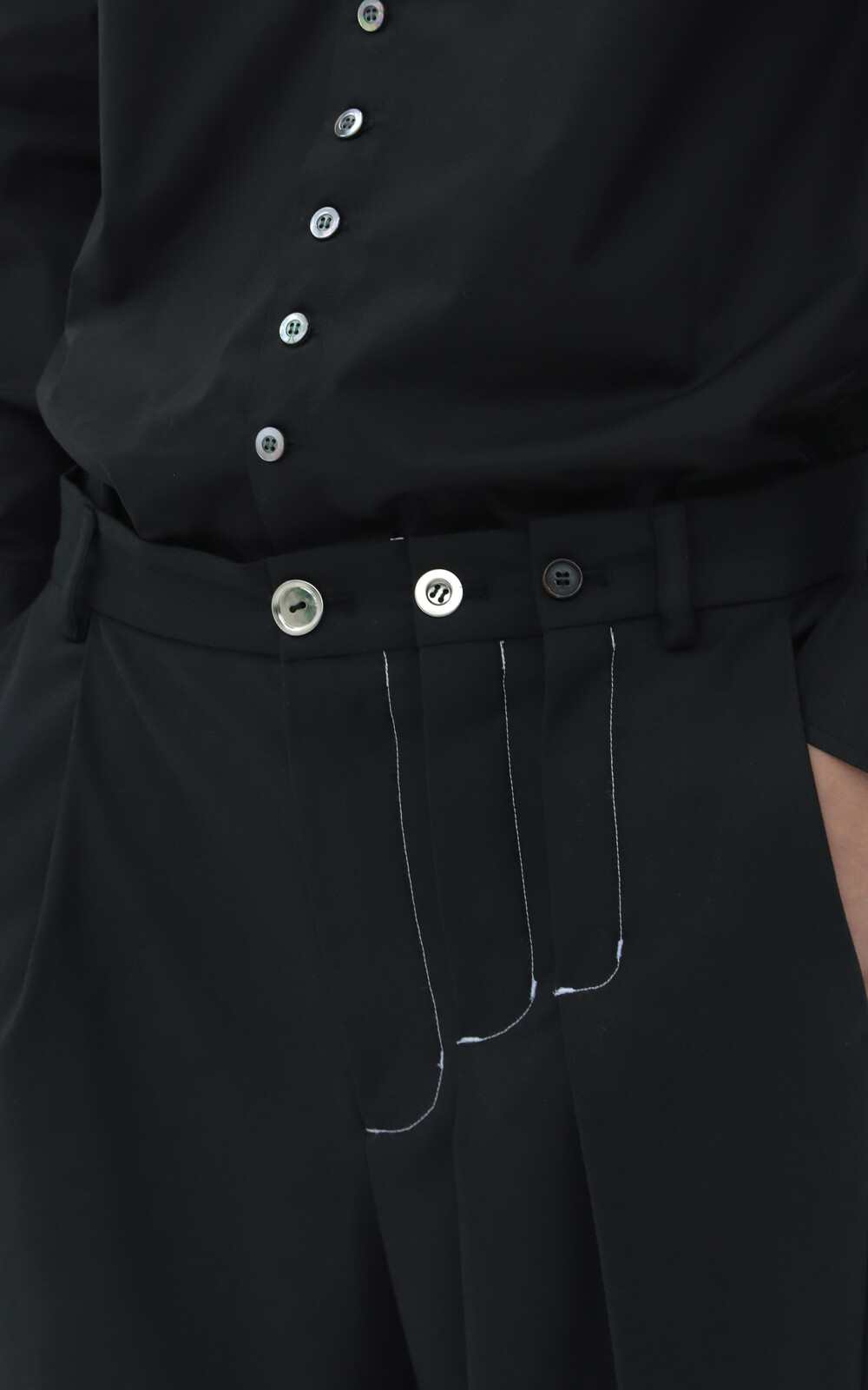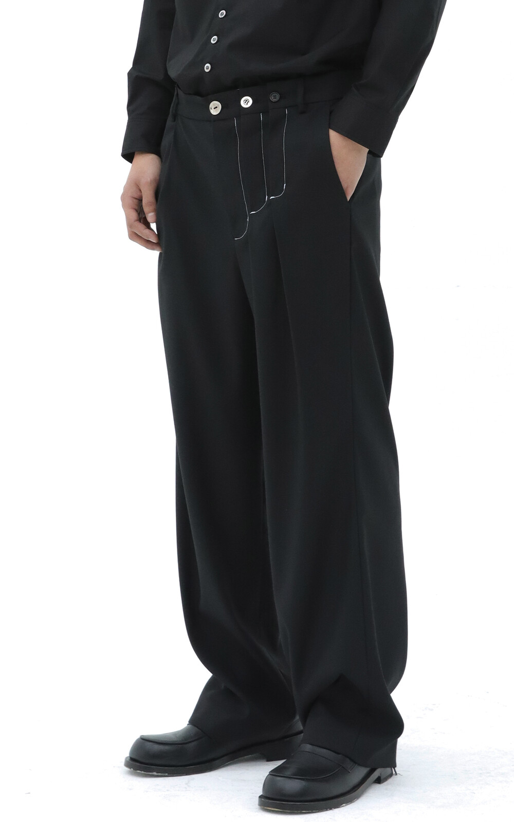 어두운 브라운 컬러로 앞 상단의 터크(주름)구조가 연달아 위치하여 바지 플라이(오프닝)가 3개로 보이는 디테일. 사이즈가 다른 3개의 메탈/소뿔 단추 사용.