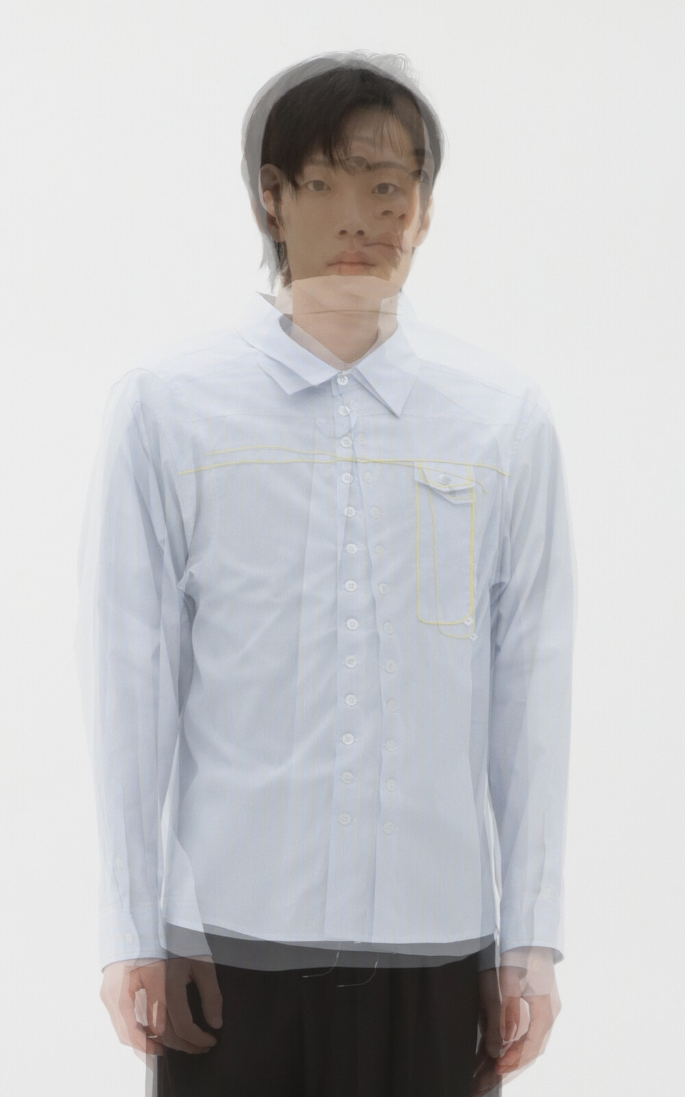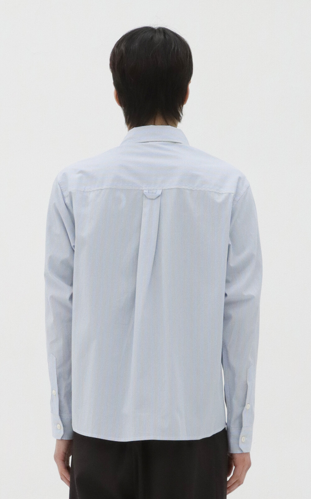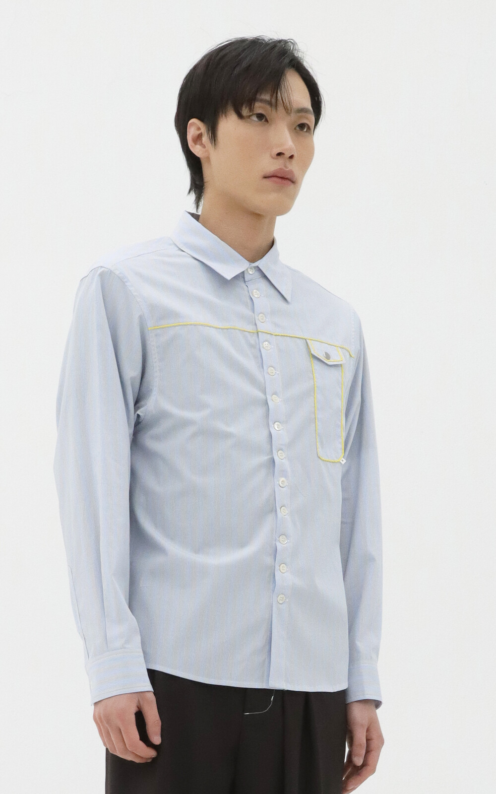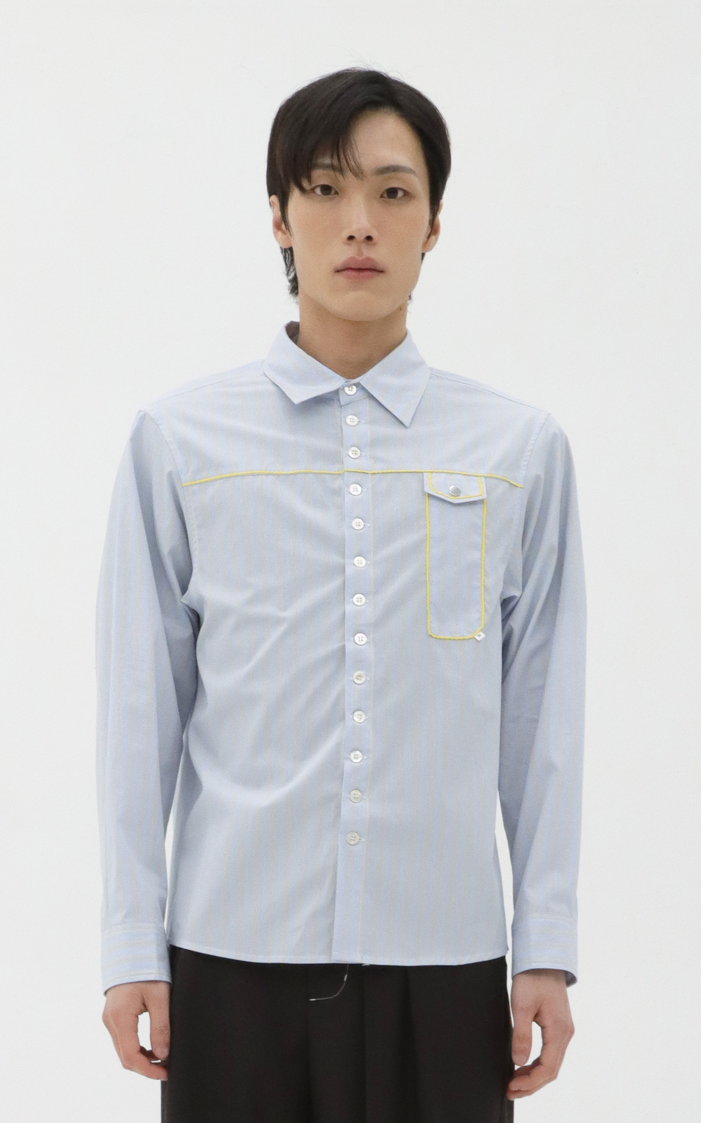 정면 상단에 요크 패널링과 왼쪽 가슴에 펜/작은안경을 담을 수 있는 패치포켓 디테일.