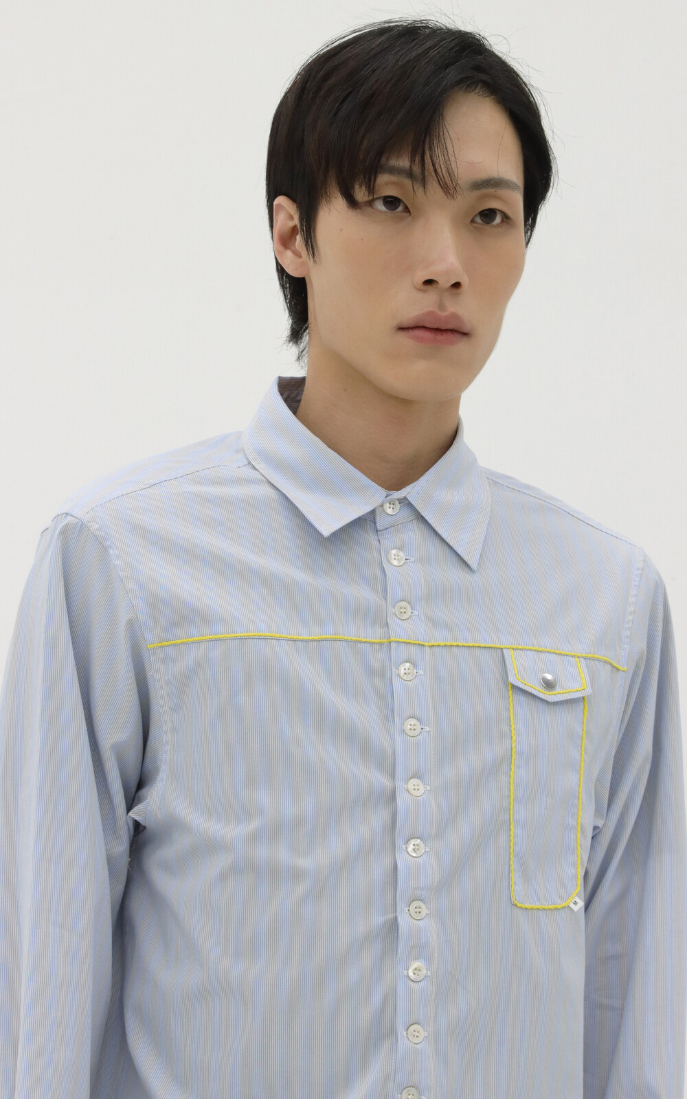 요크와 포켓(셔츠의 키 디테일)라인을 따라서 배색 탑 스티칭 처리(체인스티치 모양의 후가공).